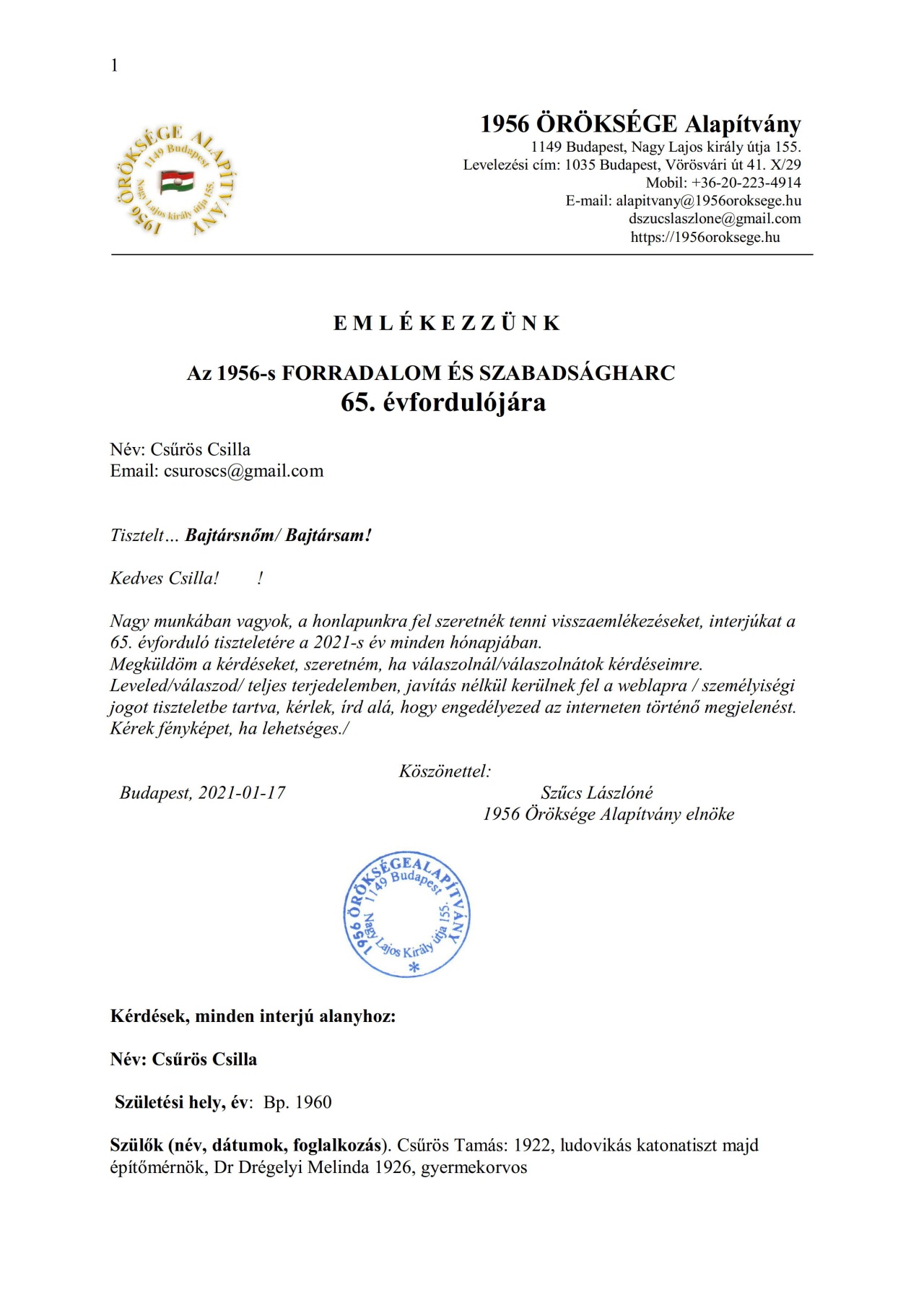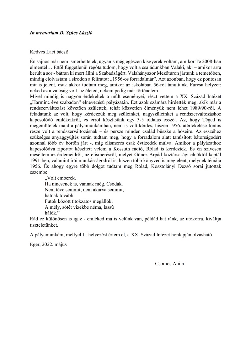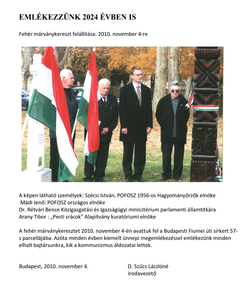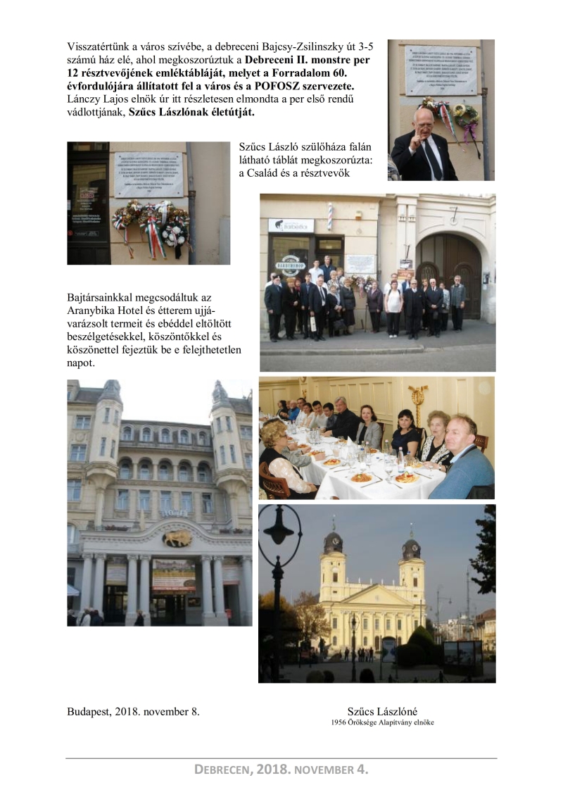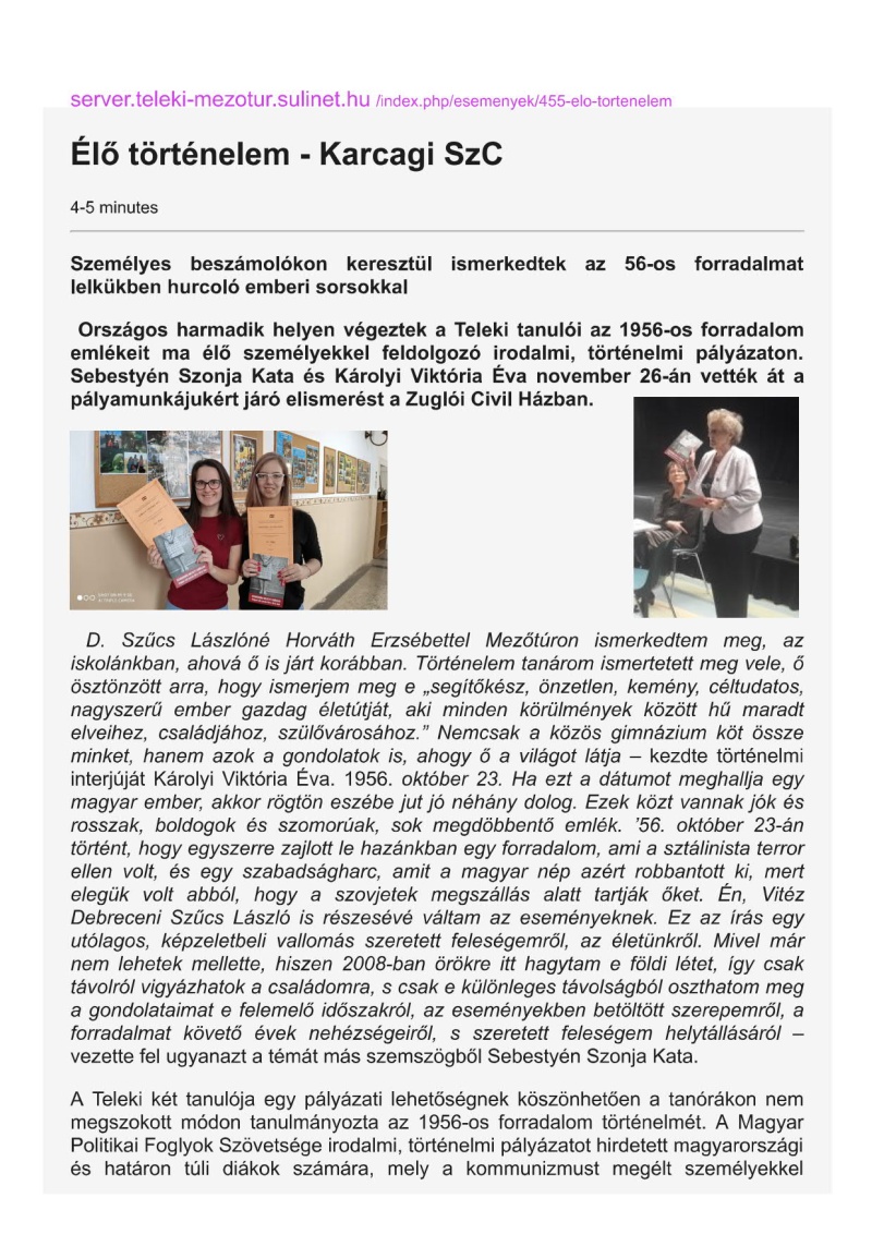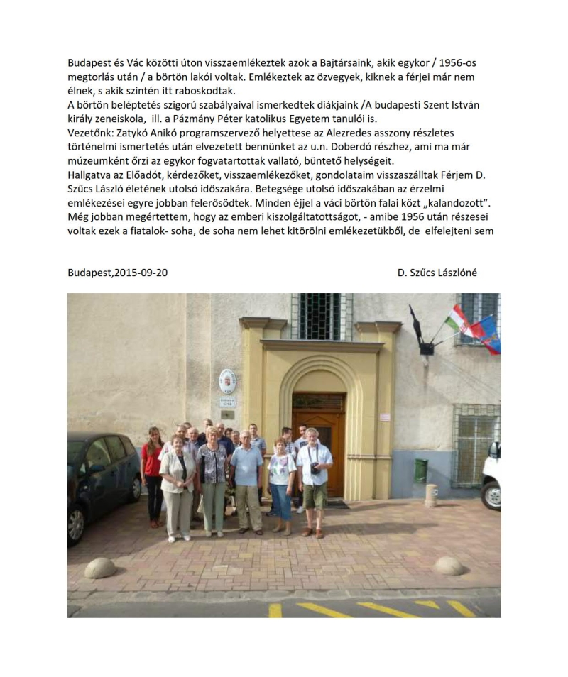 élő történelemórát az 1956 Öröksége Alapítvány szervezte Szűcs Lászlóné elnök vezetésével, emlékezve alapítónkra Szécsi Istvánra, halálának 1 éves évfordulójára. |