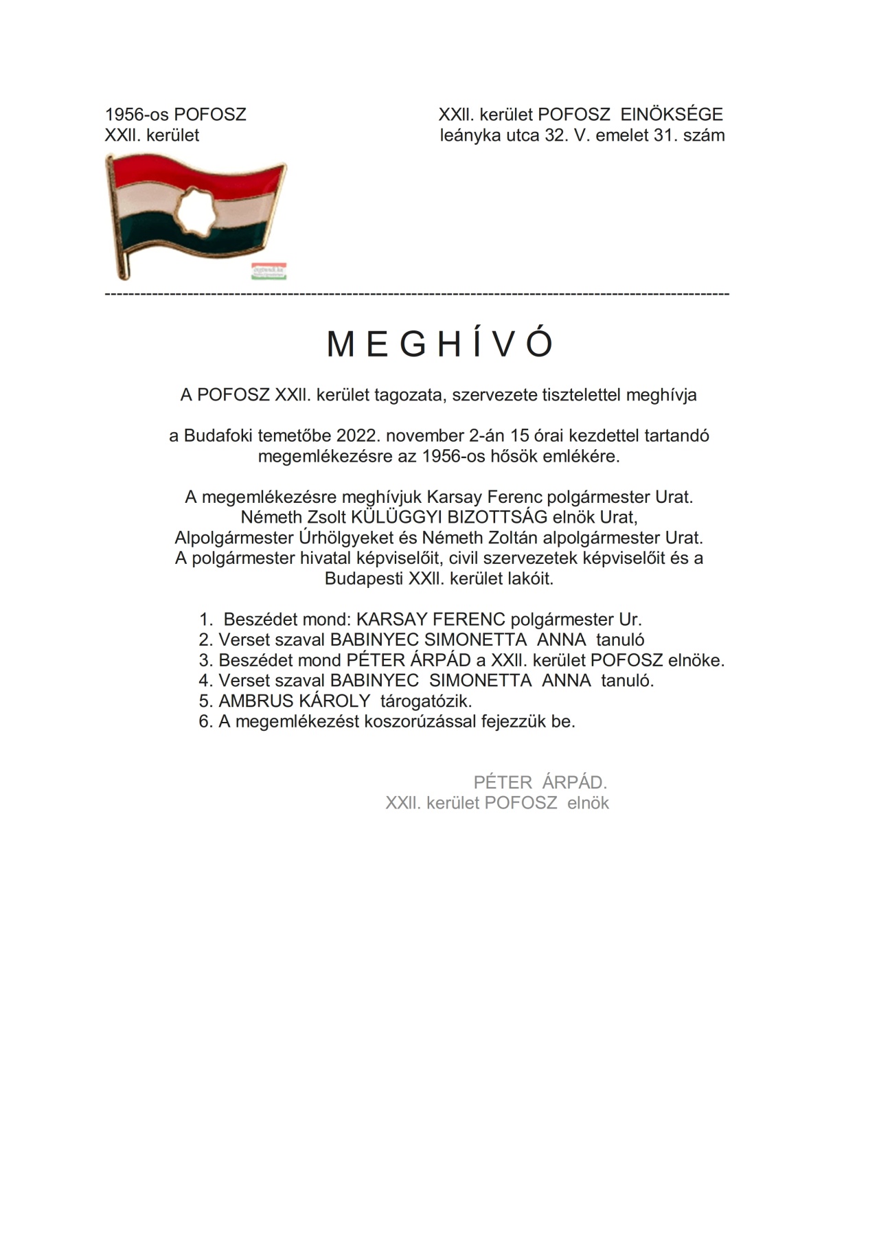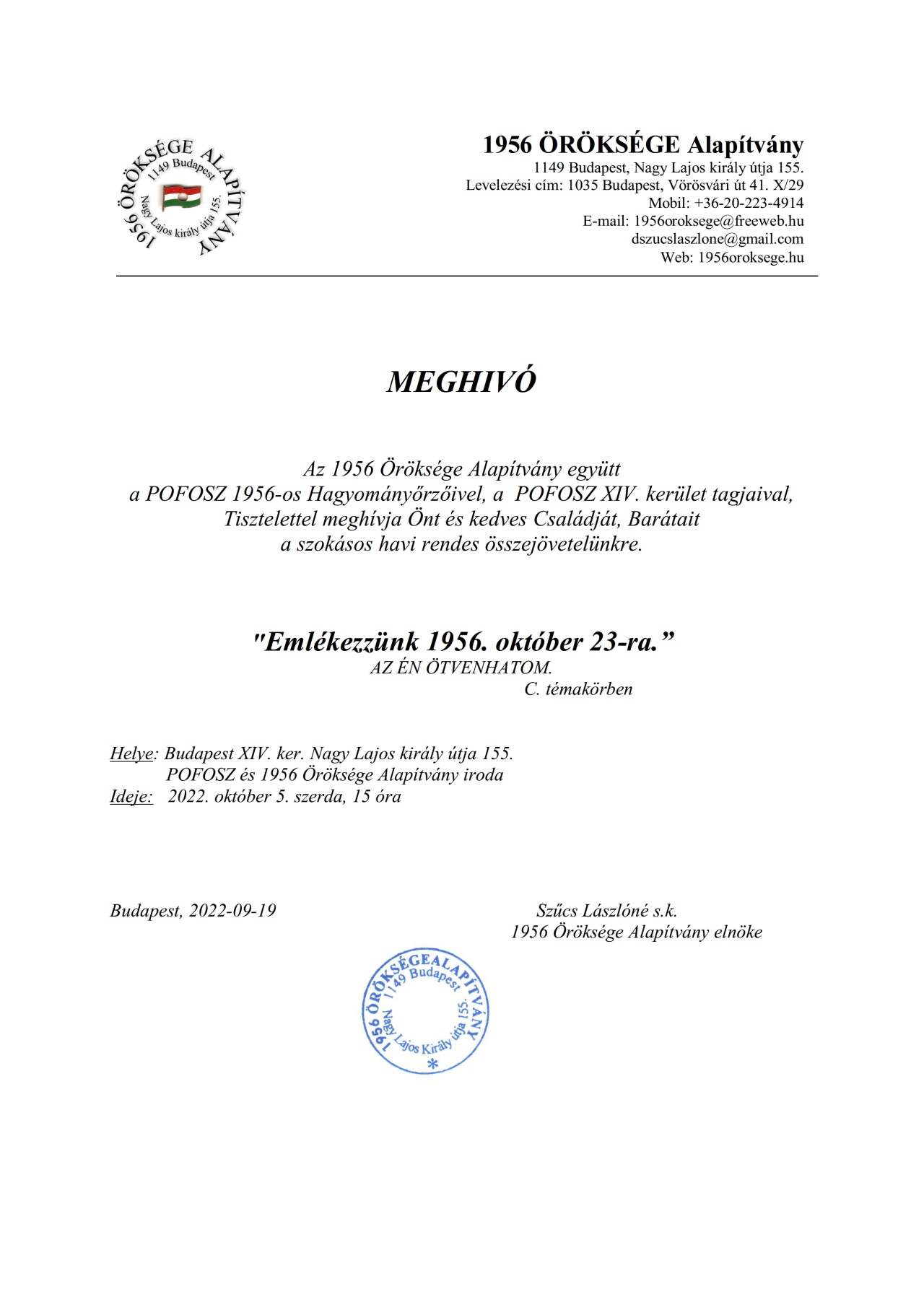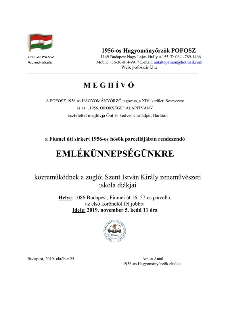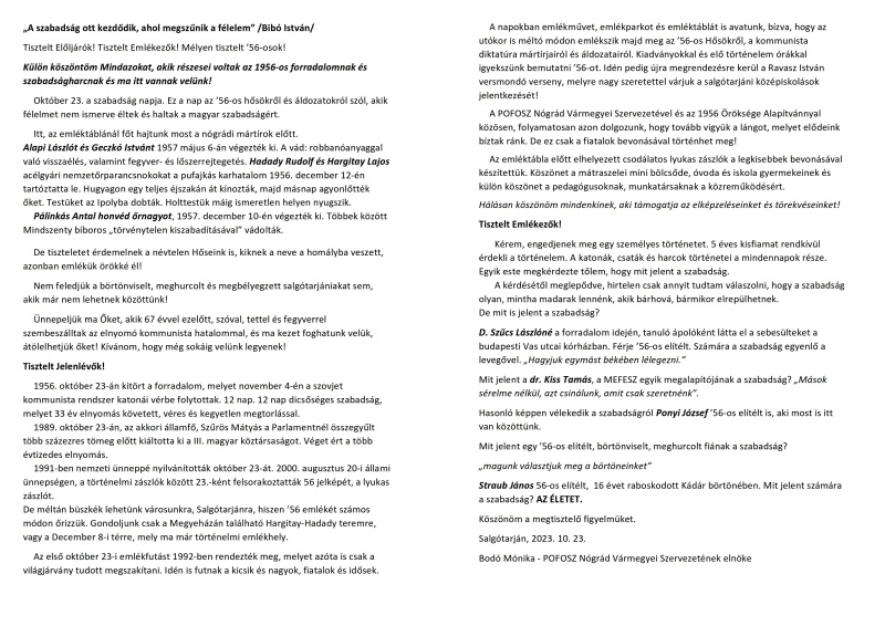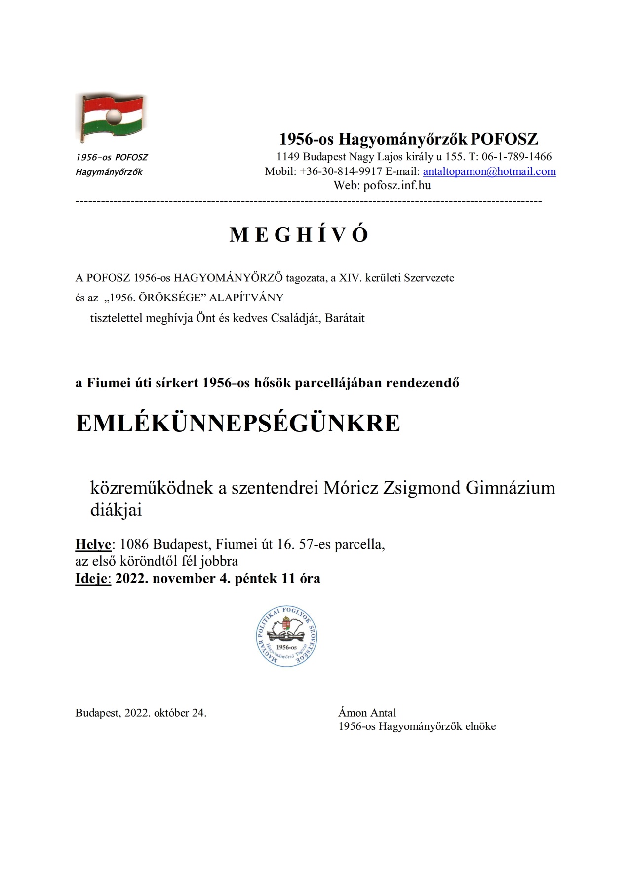 M E G H Í V Ó - Az 1956. október 23-a tiszteletére tartandó megemlékezésre,