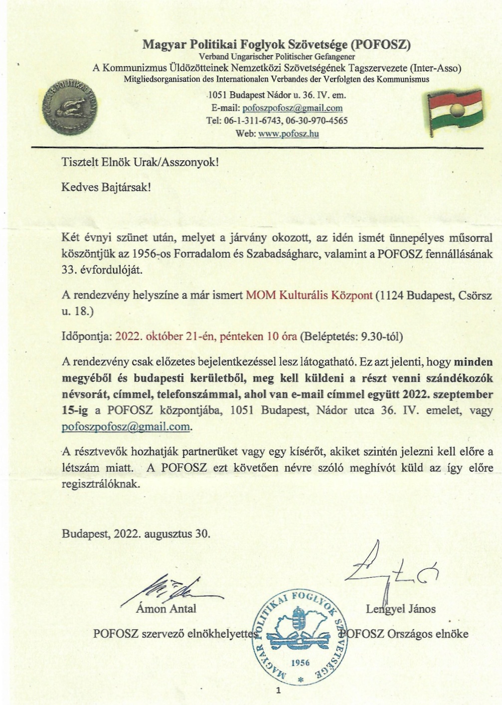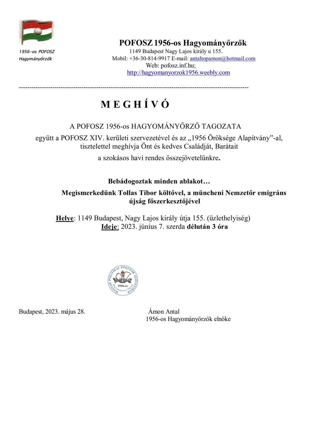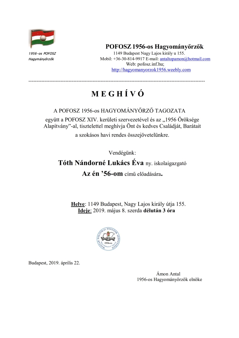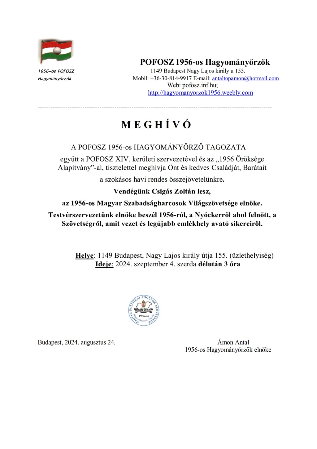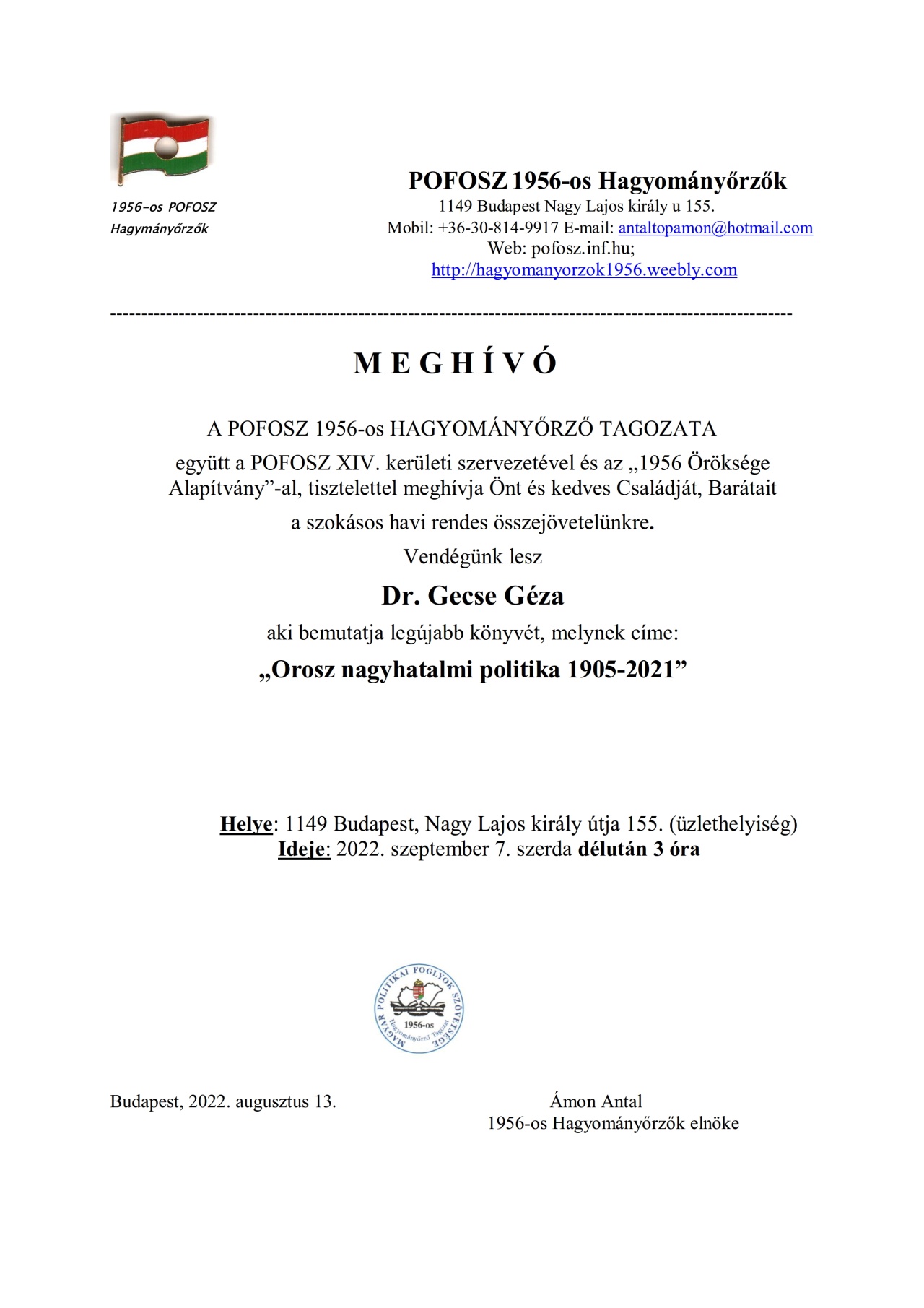 M E G H Í V Ó - Az 1956. október 23-a tiszteletére tartandó megemlékezésre,