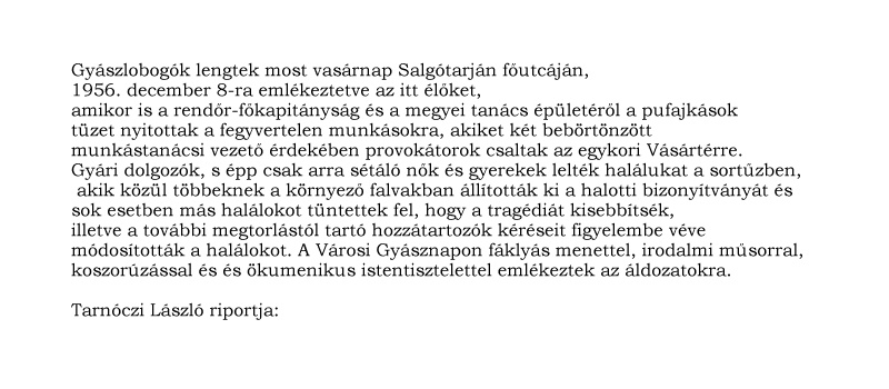| Nagy Imre és mártírtársai kivégzésének 55. évfordulóján, egy 560 felvételből álló fotóriport közlésével a forradalomra szeretnénk emlékezni. A fényképek szerzője Nagy Gyula. Ha valaki nem is olvassa végig ezt az írást, a nevet tessék megjegyezni! Ilyen heroikus alapossággal ugyanis kevesen dokumentálták a forradalom budapesti eseményeit, helyszíneit, szereplőit. |