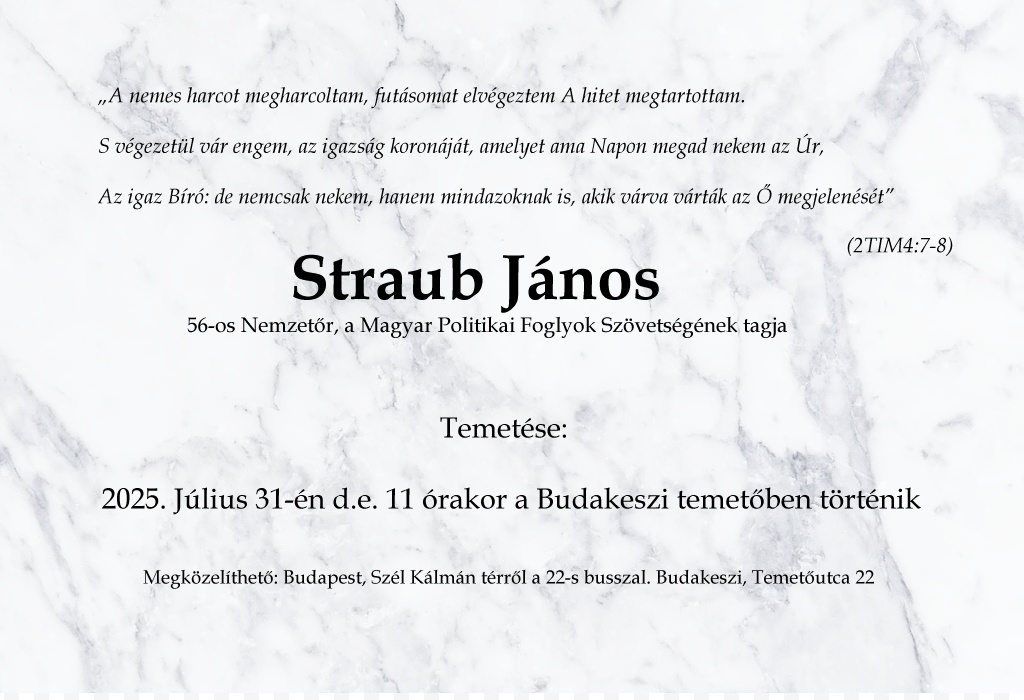 Straub Janos temetésének időpontja - 2025.07.31. de. 11 órakor