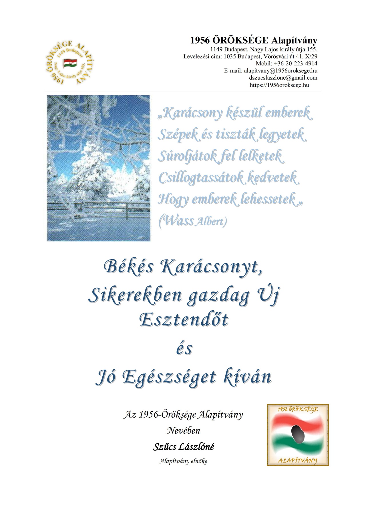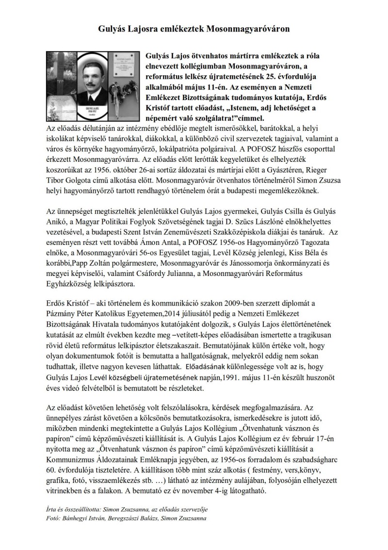 élő történelemórát az 1956 Öröksége Alapítvány szervezte Szűcs Lászlóné elnök vezetésével, emlékezve alapítónkra Szécsi Istvánra, halálának 1 éves évfordulójára. |