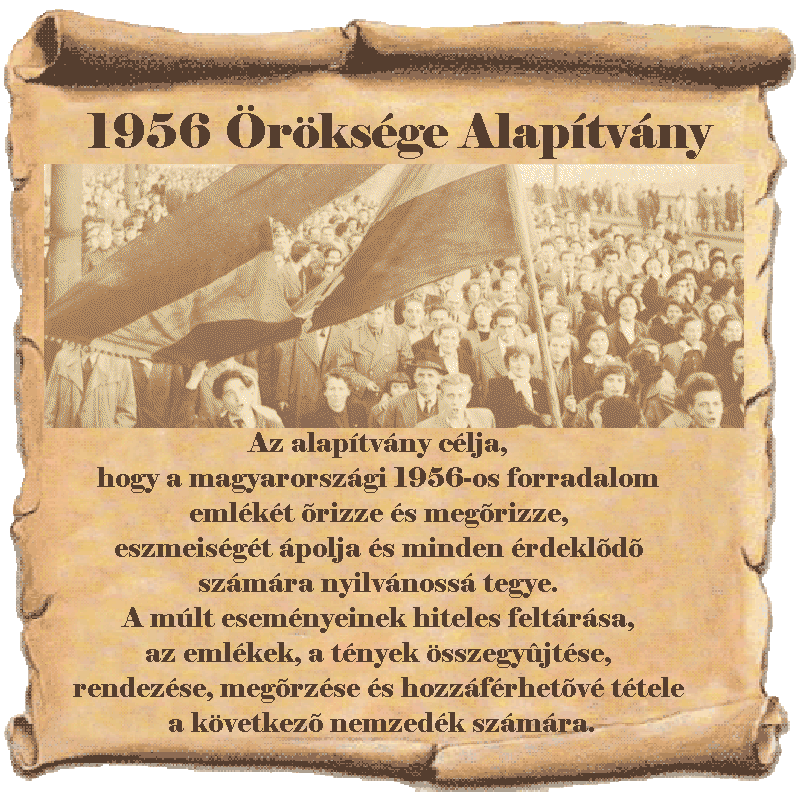 Az alapítvány célja, hogy a magyarországi 1956-s forradalom emlékét őrizze és megőrizze, eszmeiségét ápolja és minden érdeklődő számára nyilvánossá tegye. A múlt eseményeinek hiteles feltárása, az emlékek, a tények összegyűjtése, rendezése, megőrzése és hozzáférhetővé tétele a következő nemzedék számára. |