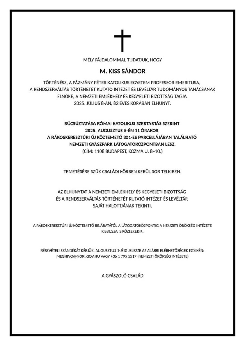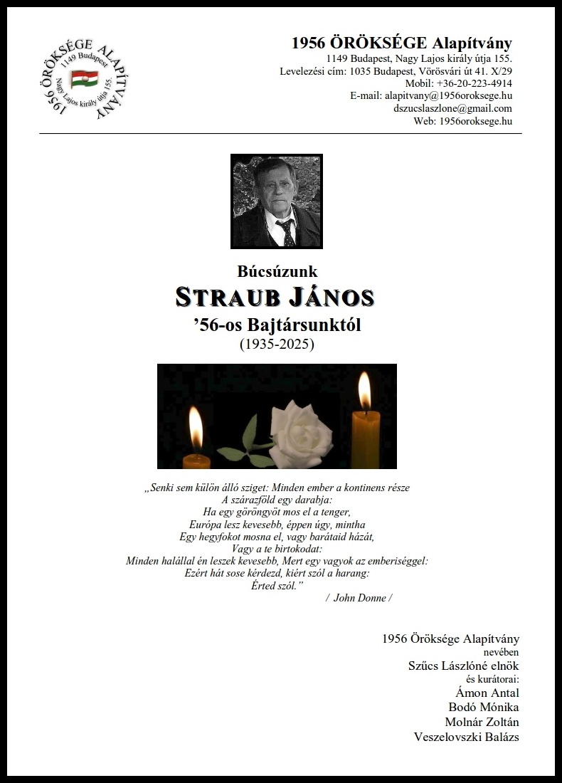 Straub Janos temetésének időpontja - 2025.07.31. de. 11 órakor