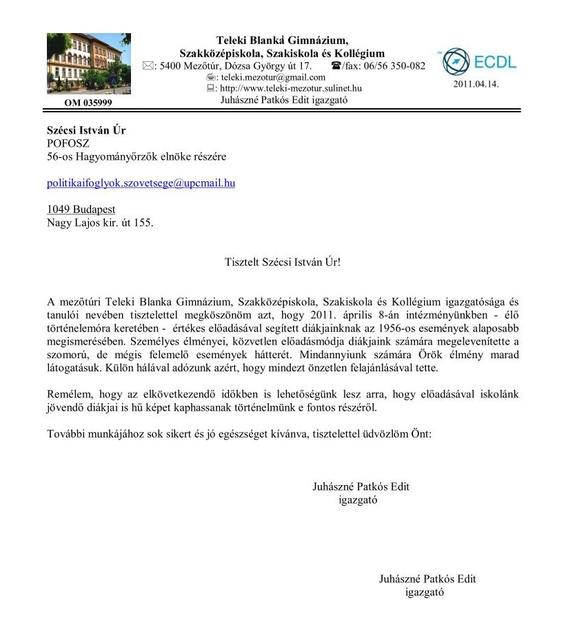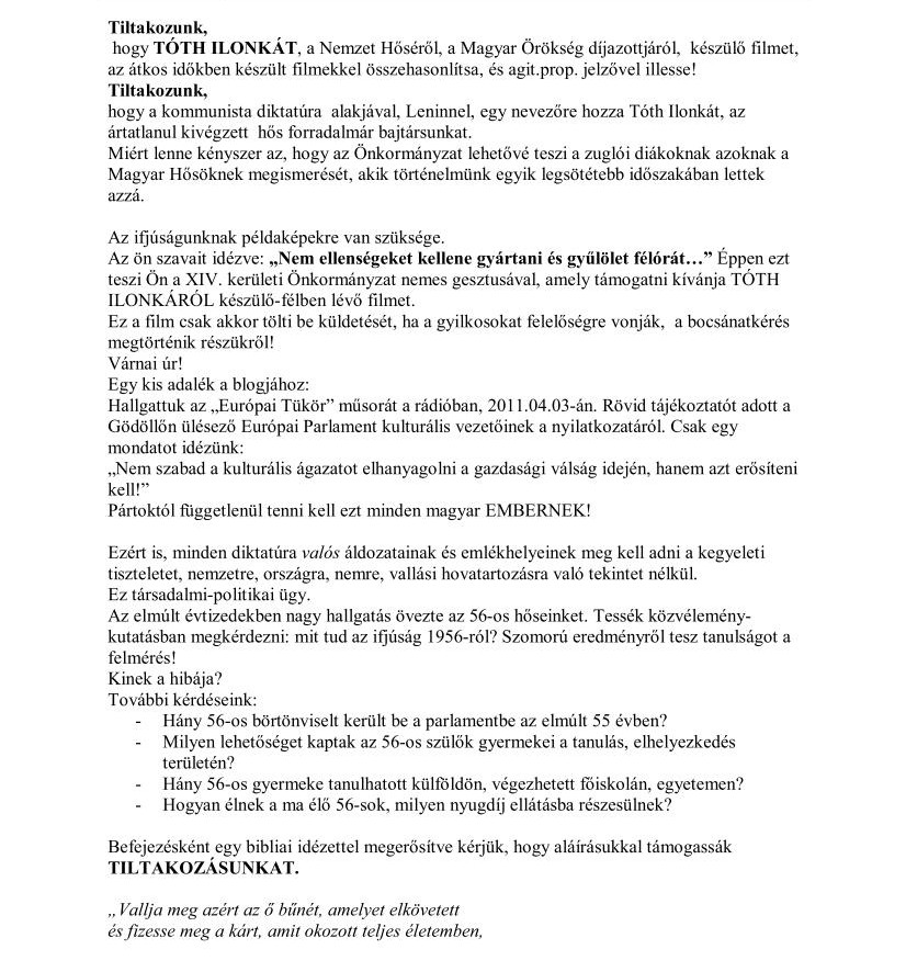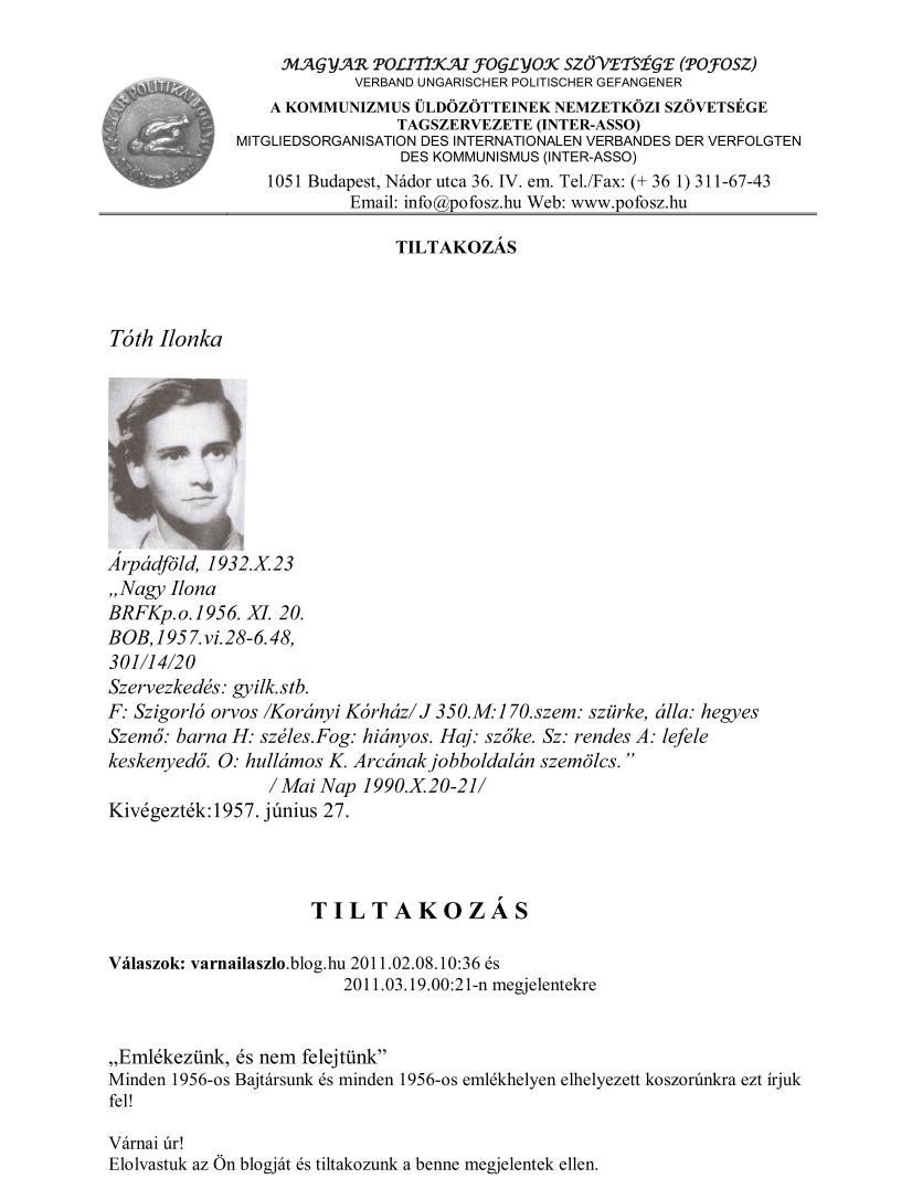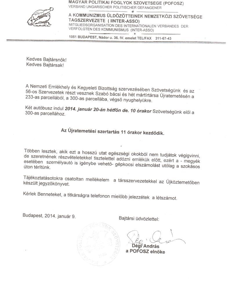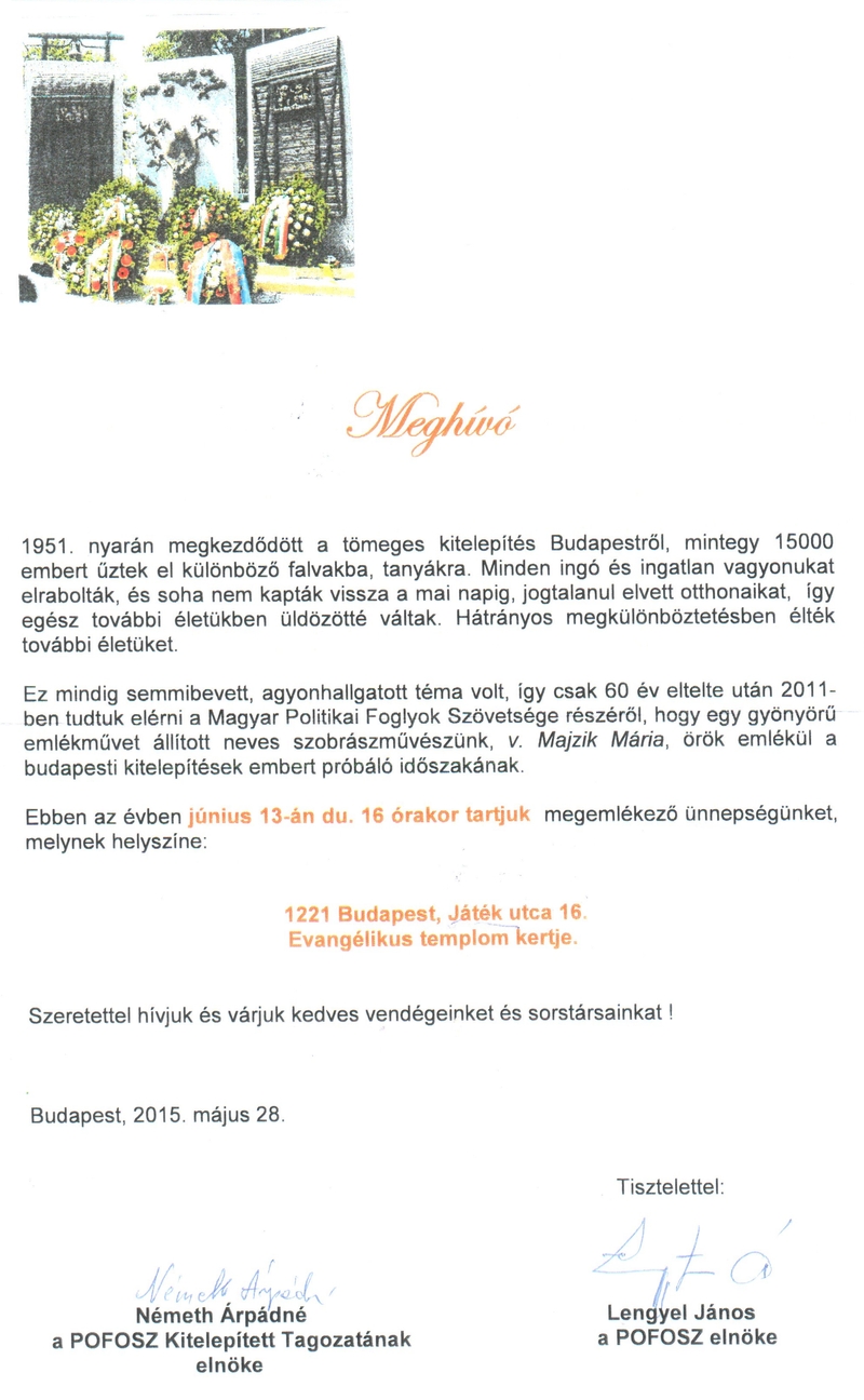 a Magyar Politikai Foglyok Szövetsége zuglói elnökének. Így a POFOSZ helyi