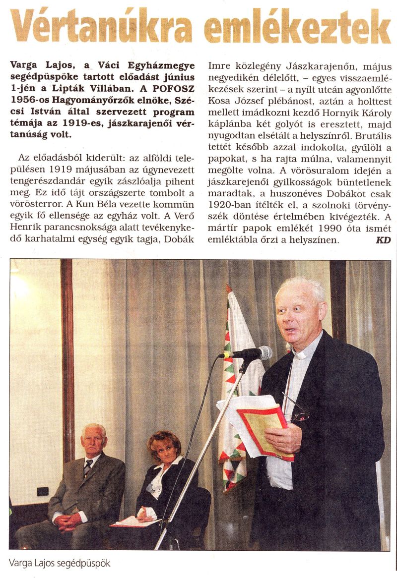 "Vértanúság Jászkarajenőn 1919-ben"